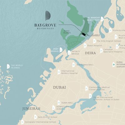 آپارتمانهای بی گروو 3 در منطقه دبی آیلند یا جزایر دبی قرار دارند. این منطقه به جزایر دیره هم معروف است. جالب است بدانید که جزایر دبی شامل 5 جزیره مجزای ساخت دست بشر است که به هم راه دارند و تماما توسط همین سازنده یعنی شرکت نخیل در حال ساخت هستند. ساخت این جزایر در مراحل اولیه است و قرار است سواحل اختصاصی، زمینهای گلف لوکس، مارینا، باشگاه قایقرانی، رستورانهای سطح بالا و مرکزخریدهای مجللی در آن ساخته شود. فاصله این منطقه تا داون تاون دبی حدود 25 دقیقه و تا منطقه دیره 5 دقیقه است!
